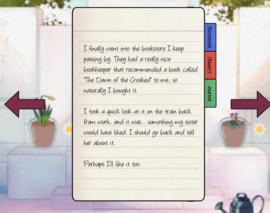 Buds is a platonic visual novel and plant care simulator developed by the Game Design and Art Collaboration club at UC Santa Cruz. You play as someone coping with the recent loss of their sister. You have just moved to a new city, Hitachinaka, aiming to get a fresh start. Although you are hesitant to move on and be open about your feelings, you slowly warm up to the new people you meet. See your relationships grow and bloom as you interact with the people of Hitachinaka!