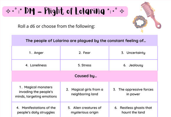 Magical Mending is a magical girl-themed TTRPG intended for 2-5 players, developed for the Experimental Tabletop RPG Design class at UC Santa Cruz. As a team, players are tasked with their duty as magical girls: To protect the realm of Lolarina and bring hope and joy to the commoners of the land. However, the magic of the land is rapidly depleting, as the common folk struggle to remain lively in the trying times befalling them.How will your team choose to help your people, while also balancing your own needs and self-care? Will you succeed in restoring magic prosperity to the land or will your magic die out permanently in your efforts to protect the people of Lolarina?