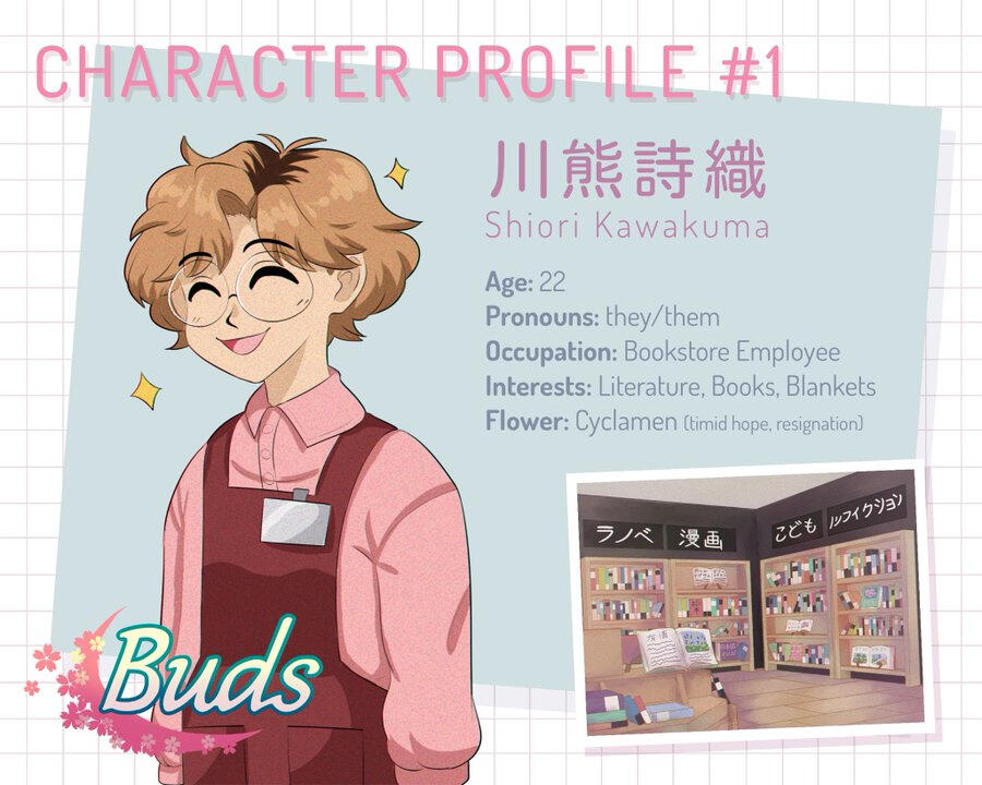 Throughout the development of Buds, I acted as the writing lead for the project. Buds was one of the first games I ever worked on, much less with a large team. I came into the project unsure of if I had the skills to lead the writing department, but I was willing to take on the challenge!My main contributions to the game were organizing narrative documents and writing the main character Shiori's dialogue. While I struggled through some aspects of writing development and team collaboration due to inexperience, the game turned out well in the end and I learned valuable lessons that I still apply to this day to my creative process.